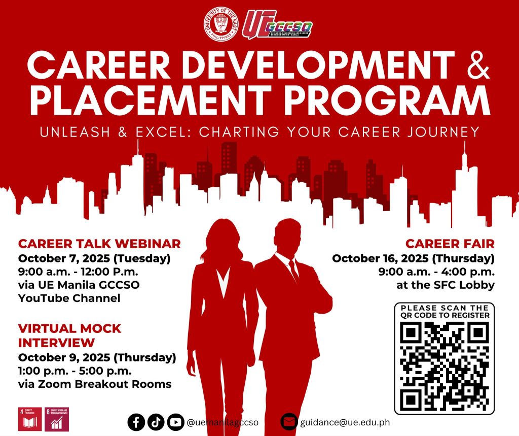 The UE GCCSO invites the Graduating and OJT College students to the following Career Development and Placement activities. Participation will be given points for their OJT Form 7.
